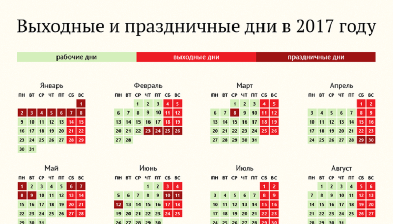 Таким образом, россиянам будет предоставлен десятидневный отдых с 30 декабря 2017 года по 8 января 2018 года, совпадающий с новогодними каникулами и Рождеством Христовым. Празднование Дня защитника Отечества продлится с 23 по 25 февраля. Также трёхдневный отдых будет на День России (10-12 июня) и День народного единства (3-5 ноября).